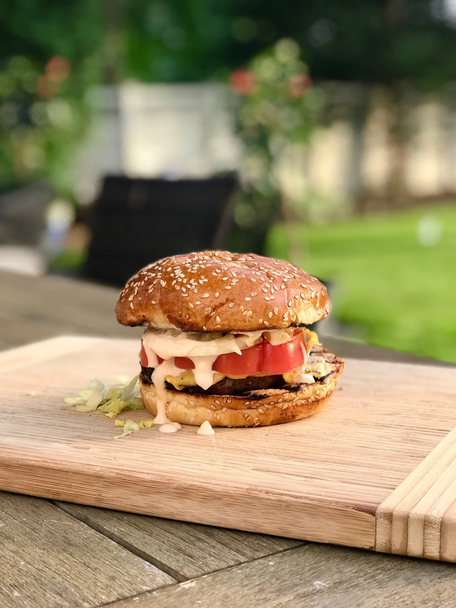 combine all of the ingredients in a medium-size bowl, stir together with a whisk. to make the "big macs," spread the sauce on toasted sesame buns and layer the cheeseburgers with shredded iceberg lettuce, tomato, onion, and pickles.